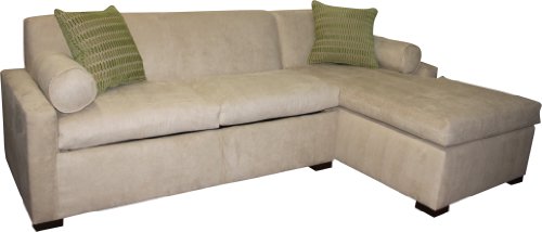 (2) Piece Sofa Sleeper Sectional with chaise.Queen Size Sleeper Mechanism.Fabric: Robert Allen Micro Fiber Color: Desert Beige (2) Decorative Knife Edge Pillow (2) Bolster Pillow, Included. Wood Block Legs: Dark Walnut Overall Dimensions: 106" w x 64" w x 34" d x 34" h